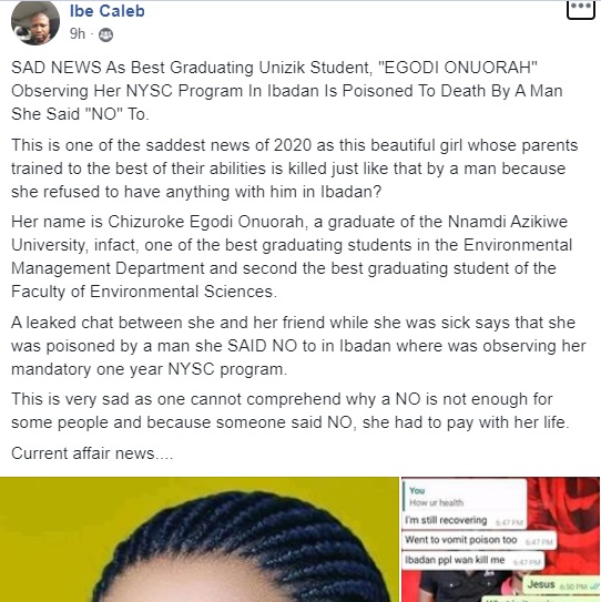 According to reports, Onuorah died after being allegedly poisoned by a man because she refused his love advances in Ibadan.