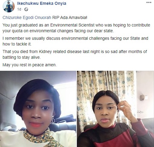 A promising woman, Chizuroke Egodi Onuorah who is said to be the best graduating student in the Environmental Management Department and second best graduating student of the Faculty of Environmental Sciences is dead.