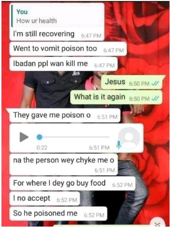 In the chat, she revealed that she was poisoned by a man she said no to in Ibadan where was observing her mandatory one year NYSC program.
